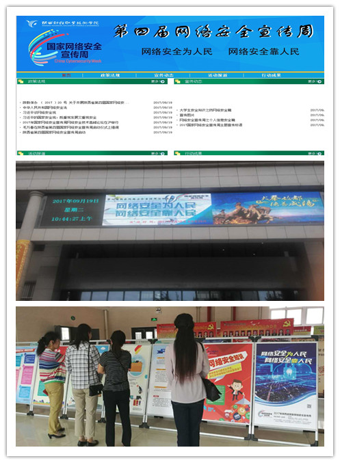 为贯彻落实中央关于网络安全和信息化的战略部署,深入宣传习近平总书记系列重要讲话和网络强国战略思想,学习关于国家网络安全和信息化系列重要讲话精神,迎接党的十九大顺利召开,根据陕西省教育厅《关于开展陕西省第四届网络安全宣传周活动的通知》(陕教保办【2017】13号),我院结合自身实际情况,开展了以“网络安全为人民,网络安全靠人民”为主题的国家网络安全周活动。