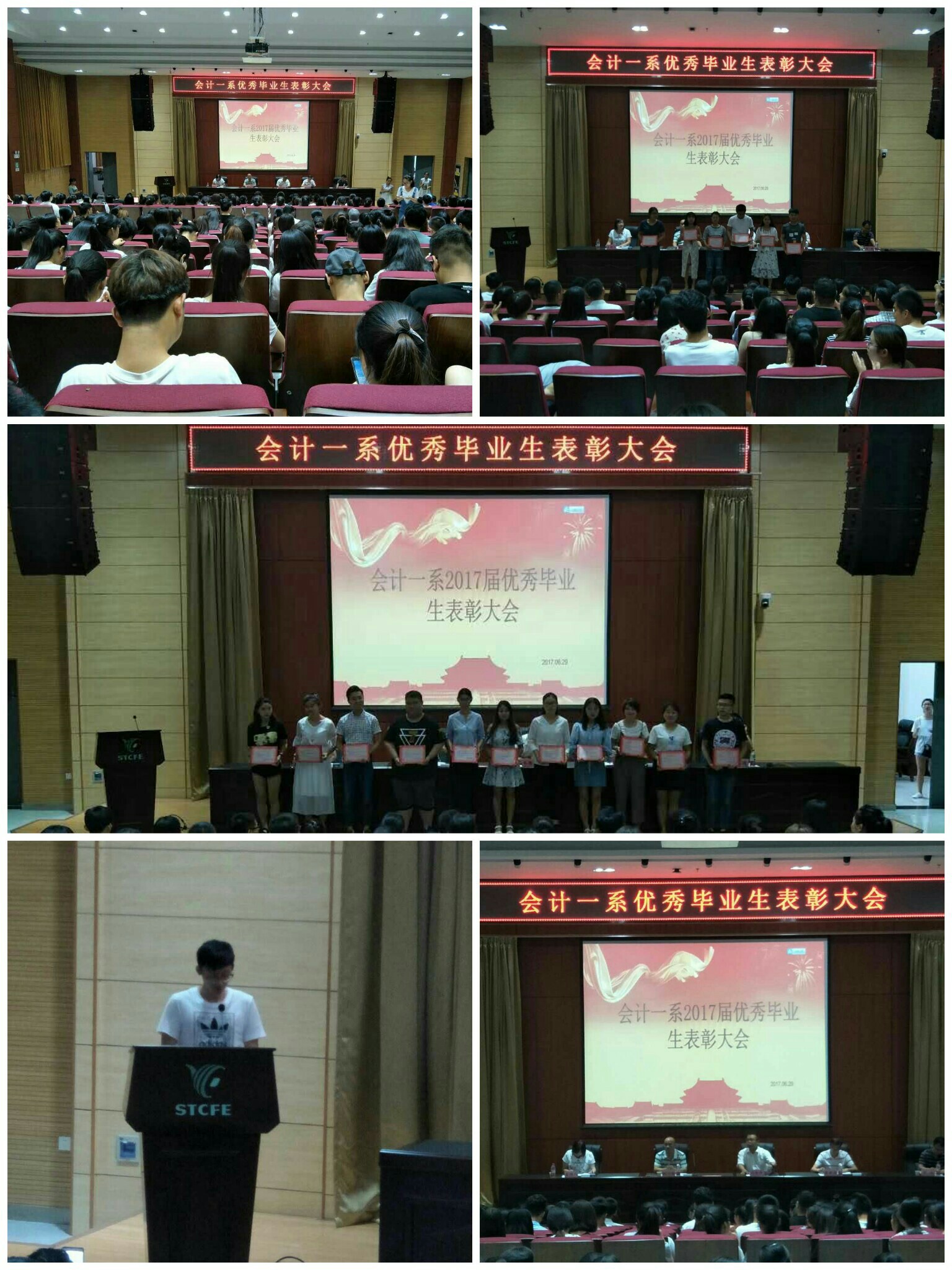 试问财院应不好,却道,此心安处是吾乡。6月29日下午五点,会计一系2017届毕业生表彰大会在学术报告厅隆重举行。全体辅导员和500多名学生参会,会计一系主任马西牛、副主任曾贵荣、专职副书记姚七栋、学生科负责人贺适出席会议并为优秀毕业生颁发证书,会议由系团总支书记张欣瑞主持。