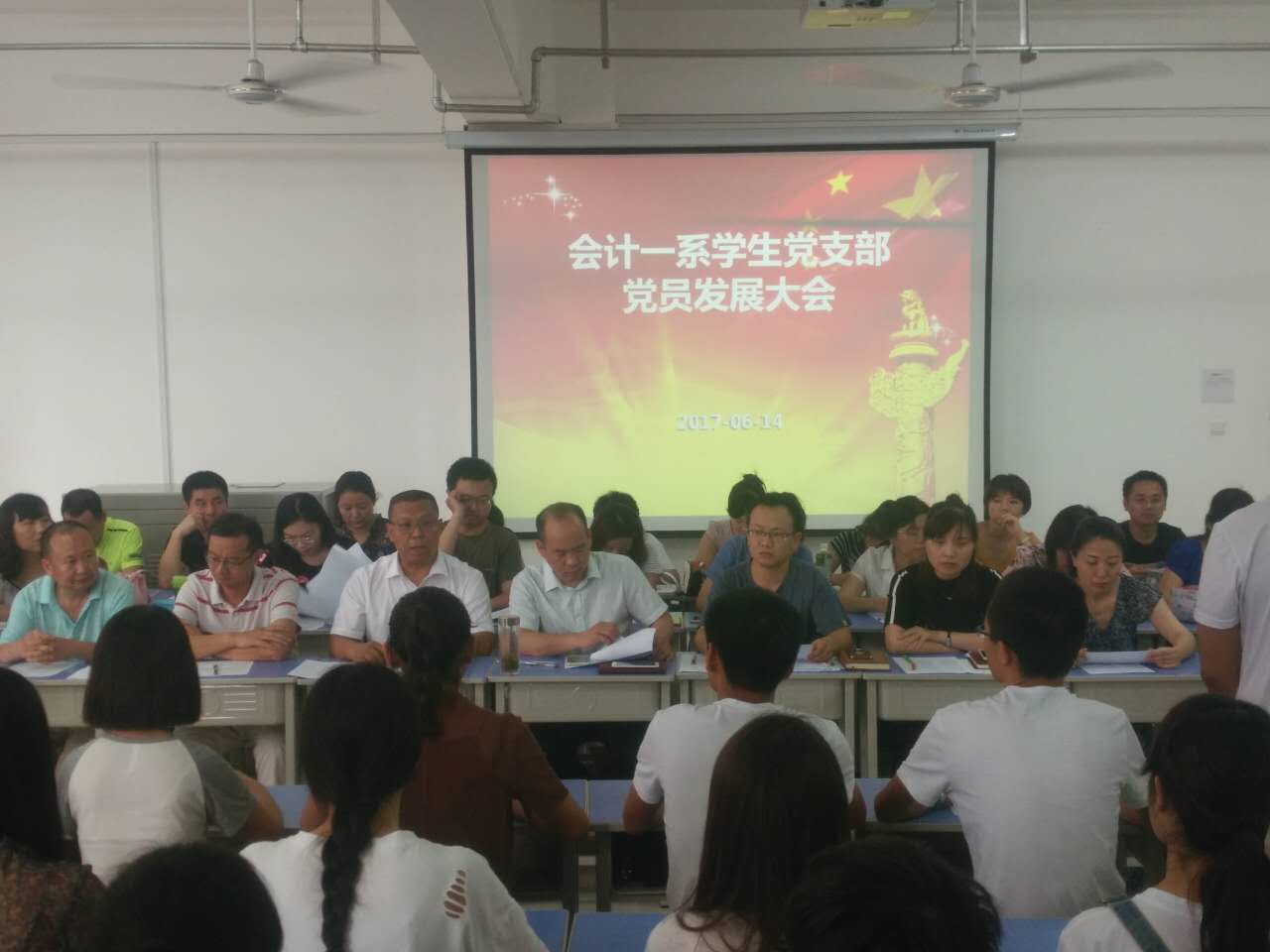 6月14日下午7点,会计一系学生党支部在综合楼202教室召开党员发展大会,全体师生党员参加,会议由学生党支部书记贺适主持。