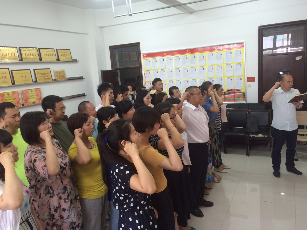 面对鲜红党旗,专职副书记姚七栋领誓,全体党员举起右拳,用铿锵有力的声音重温入党誓词,使每一名党员再一次接受心灵的洗礼,进一步激励党员牢记党的宗旨,坚定在党言党、在党忧党、在党为党的理想信念。