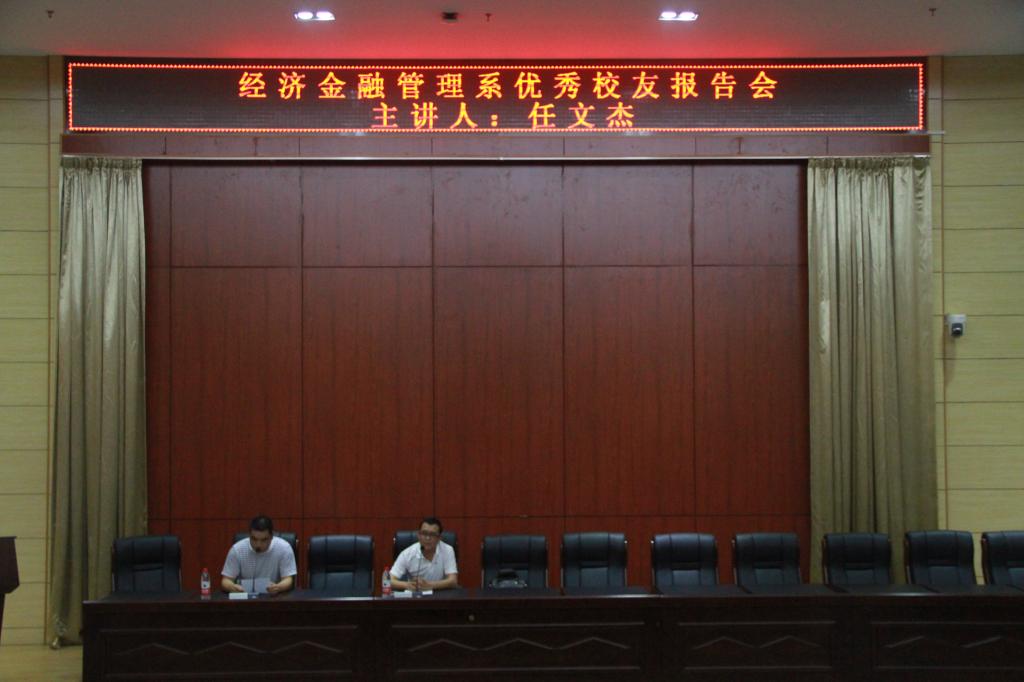 为进一步推进我院厚德育人工程,激励广大在校大学生努力学习,勇于实践,励志成才。2017年6月8日下午4点半,我系邀请优秀校友任文杰返校,在学术报告厅为我院学生作专题报告会。活动由经济与金融管理系团总支书记袁永彦主持。