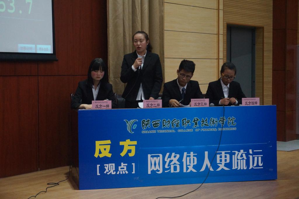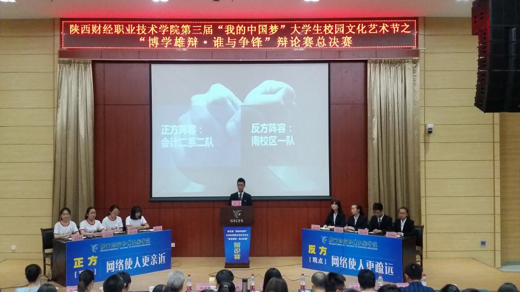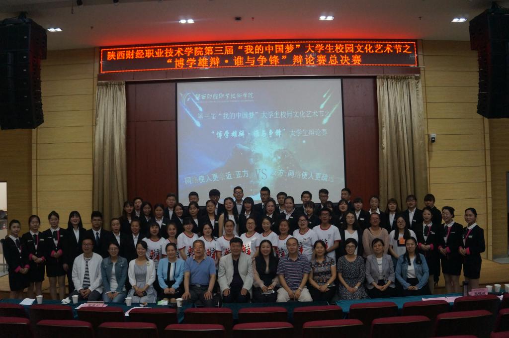2017年5月11日下午16时30分,由学院团委主办,会计二系承办的陕西财经职业技术学院第三届“我的中国梦”大学生文化艺术节之“博学雄辩·谁与争锋”辩论赛总决赛在我院学术报告厅隆重举行。学院党委副书记兼纪委书记刘文雅、会计二系主任李启明、团委书记窦曼娟、会计二系专职副书记乔晶策、会计三系专职副书记张晓战、经济与金融管理系专职副书记王省军出席并观看了比赛。图书馆馆长崔斗、语文艺术教研室主任田会云、传统文化教研室主任王娟和宣传处张洁老师担任比赛评委。450余名师生共同观看了此次总决赛。