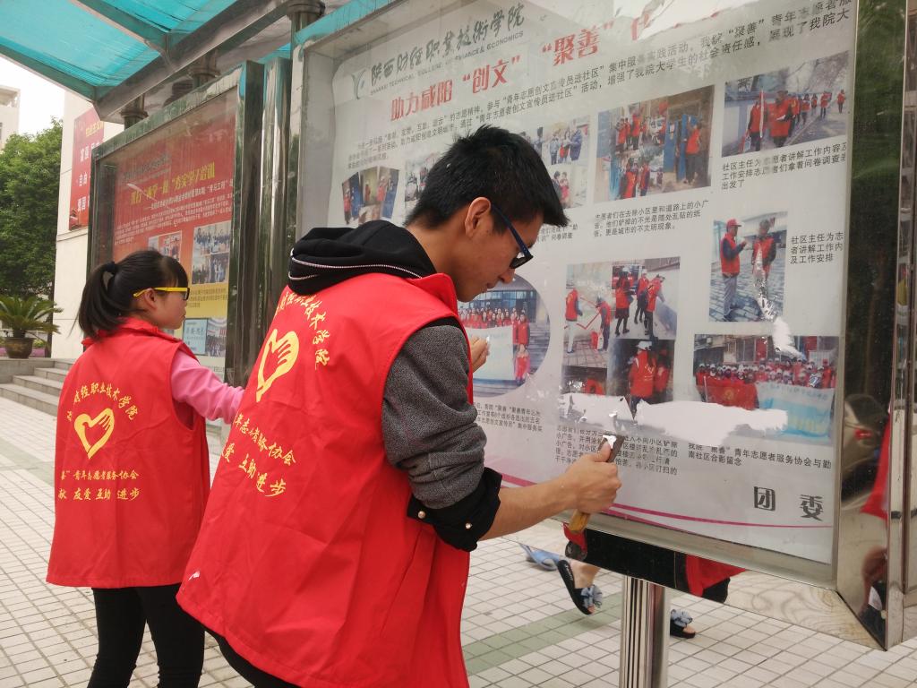 为进一步弘扬“奉献,友爱,互助,进步”的志愿精神,开展“助力咸阳创建文明城市”集中服务实践活动,我院团委组织“聚善”青年志愿者协会的志愿者们分别于2017年5月6日和7日在校园内和秦皇北路社区开展了志愿服务活动。