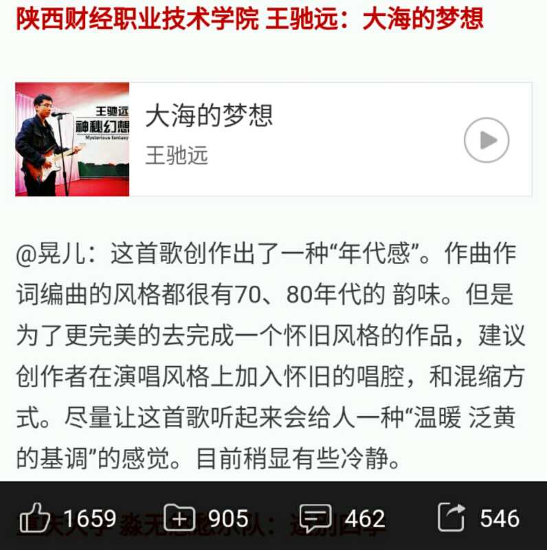 近期,在网易云音乐全国原创歌曲大赛中,我院大学生艺术团2015级会计二系会计5班王驰远同学带着他的原创歌曲《大海的梦想》参加了大赛。全国共有163163名大学生提交了参赛作品,涵盖全国所有高校在校原创音乐人,王驰远成功入围,经过重重筛选获得全国第六名的好成绩,成为陕西地区唯一一位入围的前十名选手。