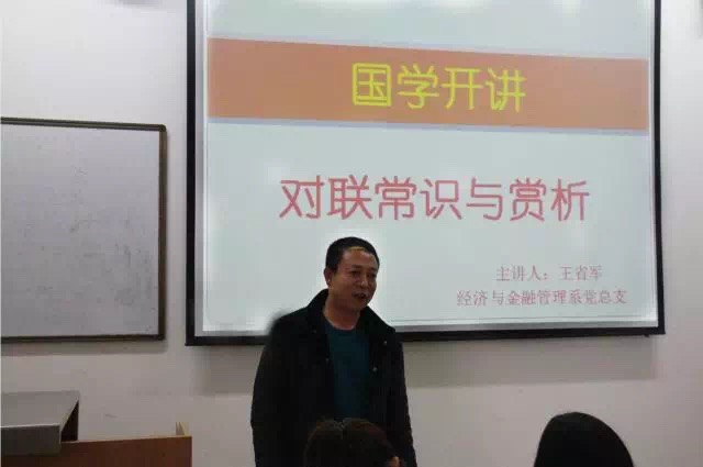 3月15日下午4时,经济与金融管理系党总支“国学开讲”专题活动在综合楼626教室举行,系专职副书记王省军为全体党员和部分学生干部开讲第一课:《对联常识与赏析》,带领大家领略了汉字文化的神奇与妙趣!