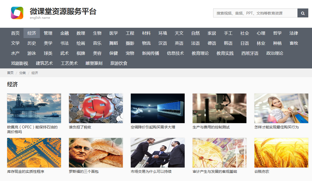 《微课堂资源服务平台》共分经济,管理,金融,数理,生物,医学,工程,材料,环境,天文,自然,家居,手工,社会,心理,哲学,法律,文学,历史,美学,书法,绘画,音乐,舞蹈,摄影,物流,汉语,英语,法语,德语,韩语,日语,林业,种植,畜牧,水产,游泳,球类,武术,棋牌,美容,保健,宠物,新闻联播,信息技术,教育理论,教育实践,西班牙语,政治理论,戏剧影视,建筑艺术,工艺美术,雕塑篆刻,旅游饮食等50多个科目。