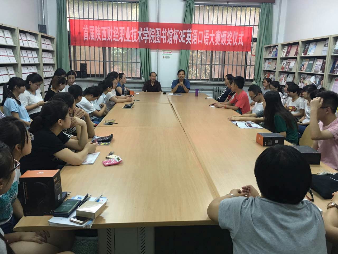 陕财职院3E英语口语大赛颁奖仪式于6月28日下午5点10分在图书馆人大资料阅览室举行,基础部主任张拓、图书馆副馆长崔斗、北京策腾教育科技有限公司西安3E英语项目经理贾素娟以及获奖师生和部分英语爱好者50余人参加了颁奖仪式,颁奖仪式由崔斗主持。