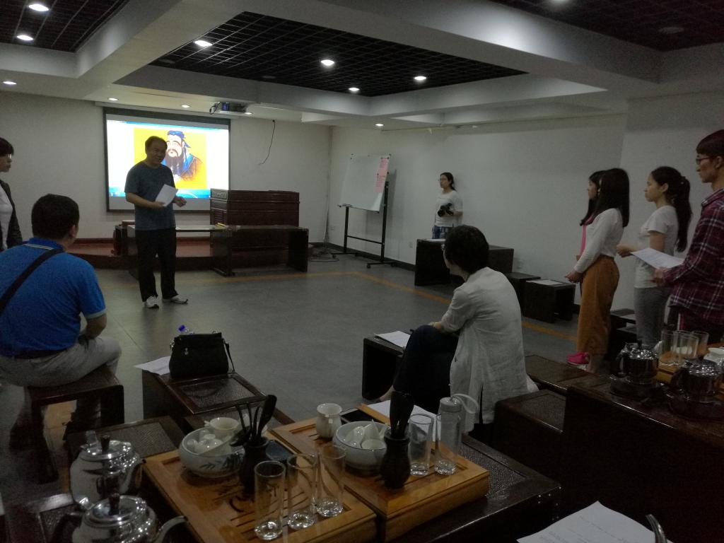 随后,宋院长带领考察组一行进入国学实训基地进行实地参观。图书馆前的孔子像含笑屹立,古色古香的茶艺室里,同学们正在认真倾听着端庄婉约的茶艺老师老师讲授《茶叶的冲泡》;翰墨飘香的书画室里,同学们向年逾八旬的老书法家虚心请教《楷书技巧》;国乐室里,同学们正在专注的练习古筝技法,琴瑟和鸣,令人悠然神往;另一个大演练场,多媒体屏幕上挂着至圣先师孔子的像,国学讲习团的同学们在礼仪老师指导下,正为下半年9月28日孔子诞辰排练祭孔大典……通过对这些实训现场的参观和学习,使考察组看到了一个办学理念清晰、师资强大、设施完备、成效卓著的国学教育基地。