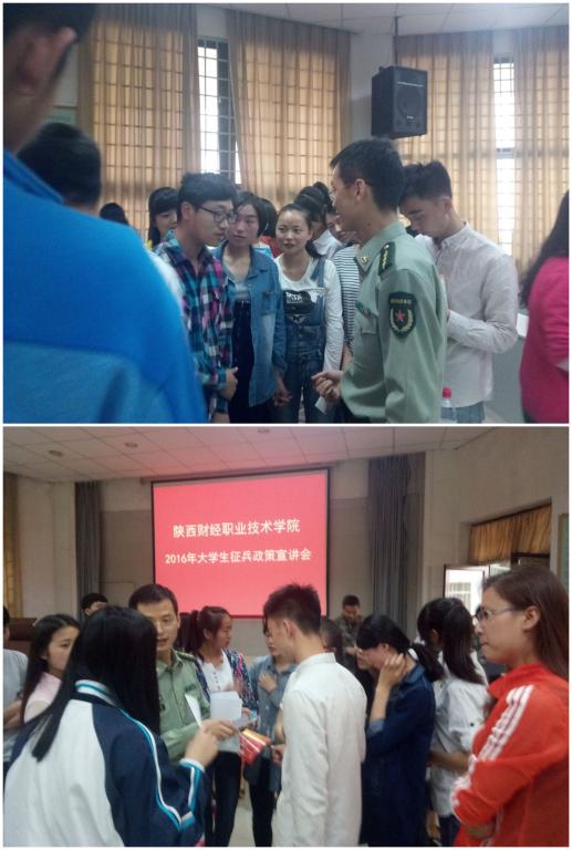 5月12日下午,由学生处、秦都区武装部、吴家堡办事处武装部组织的2016年大学生征兵政策宣讲会在我院东阶梯教室召开。秦都区武装部政工科科长黄超、军事科参谋雎璋、政工科干事刘卫疆、吴家堡办事处武装干事史亚娟一行四人对广大学生做了宣传动员,我院4名辅导员老师和240余名学生代表参加。