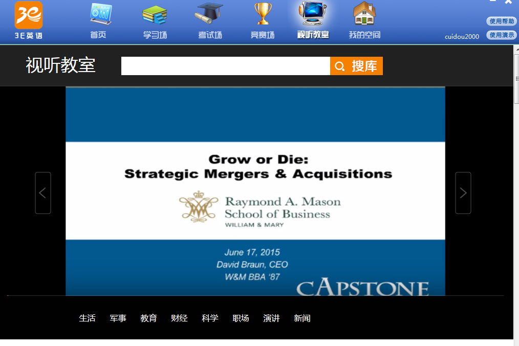 ◆ 【视听教室】包含教育、科技、经济、军事、新闻、生活等8个门类的视听类学习资源,可以帮助学生在练习听力的同时,开阔国际视野,了解世界各个领域的发展。