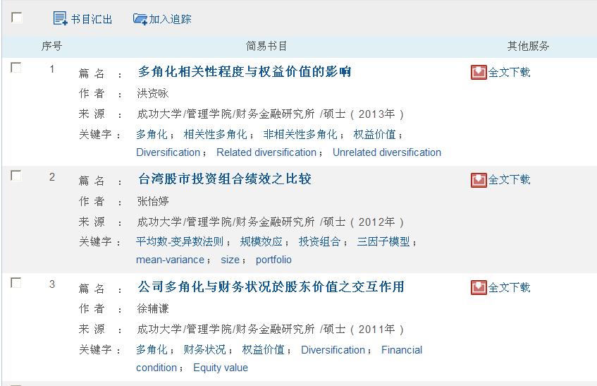 3. 查询结果:查询出的每篇文章,可通过「检索结果再查询」的功能,缩小查询结果。并可暂存检索结果,做为下次检索条件。使用者也可勾选所需论文,并可在「已选论文」功能项中浏览并输出。