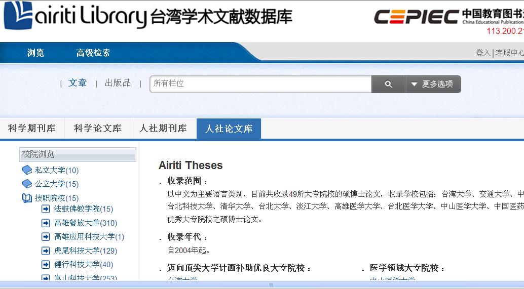 华艺-台湾学术文献数据库是台湾做学术资源最大,收录范围最广,收录资源为最核心的数据库,已成为全球图书馆查找台湾学术研究资源最重要的电子资源。包括学术期刊和硕博士论文两类资源。《台湾学术期刊数据库》收录期刊共1,552种,台湾期刊1483种。其中自然科学(理)期刊计65种、应用科学(工)期刊167种、医学期刊239种、生命科学期刊64种、人文学期刊470种、社会科学期刊776种;期刊电子全文323,028篇。收录基础:SCI、SSCI、EI、Medline、CA、TSSCI、THCI Core等指标、并以曾经获奖、符合学术论文格式以及图书馆、学者推荐为收录标准。TSSCI收全率达84%、THCI收全率达78%;《台湾学位论文数据库》是台湾最大的学位论文数据库,收录台湾51所高校78662篇学位论文,独家收录台湾大学的硕博士论文;
