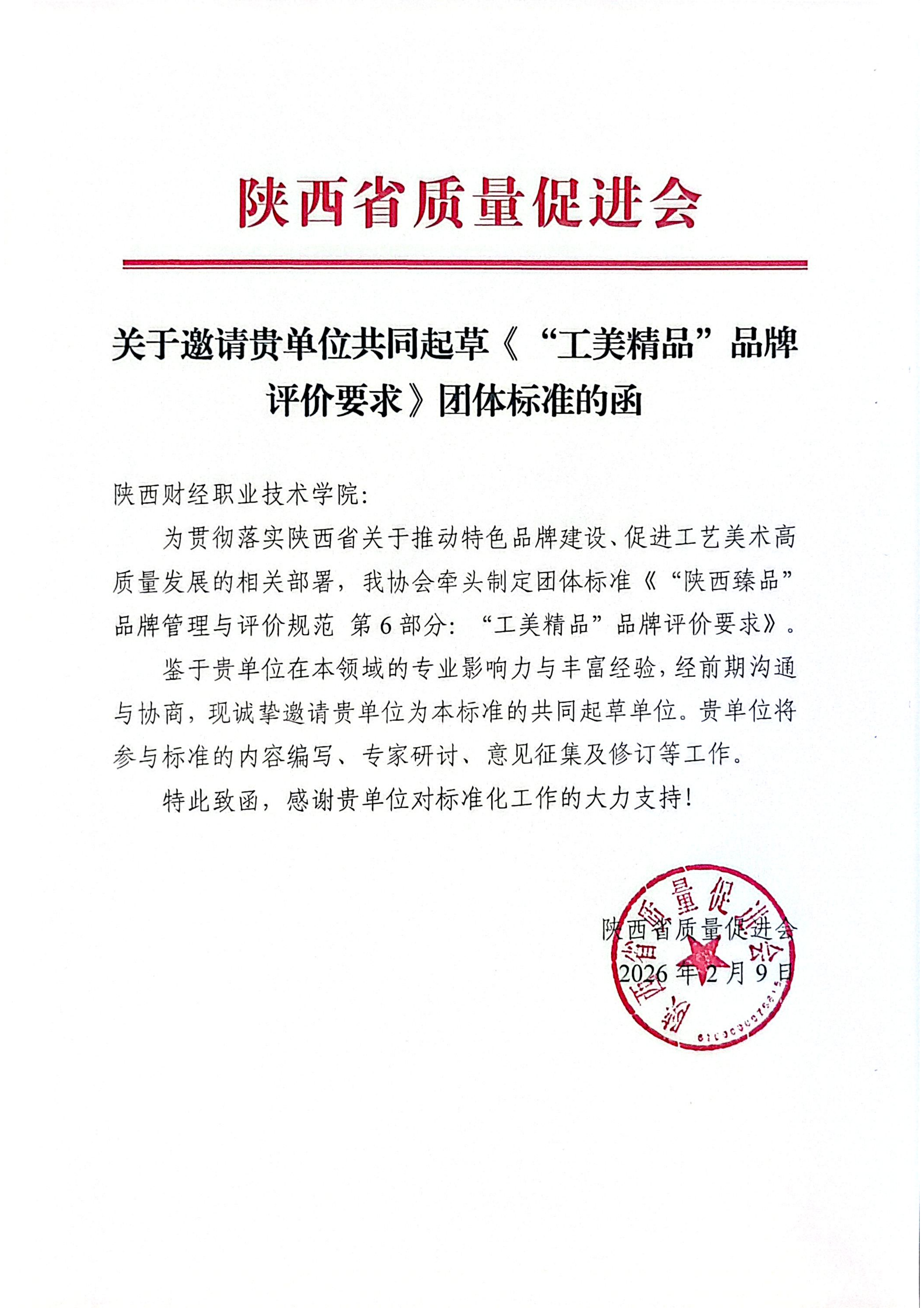 近日,受陕西省质量促进会正式委托,我校作为共同起草单位,参与了团体标准《“陕西臻品”品牌管理与评价规范第6部分:“工美精品”品牌评价要求》的编制工作。该标准已正式发布,标志着我校在服务区域品牌建设、推动工艺美术高质量发展方面迈出了坚实一步。