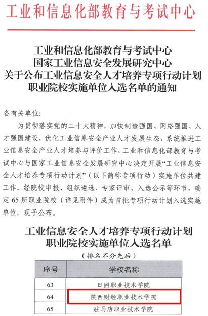 近日,工业和信息化部教育与考试中心、国家工业信息安全发展研究中心联合印发《关于公布工业信息安全人才培养专项行动计划职业院校实施单位入选名单的通知》,确定全国65所职业院校为首批工业信息安全人才培养专项行动计划入选实施单位,我校为65所职业院校之一,学校信息安全技术应用专业成为该项目合作专业。
