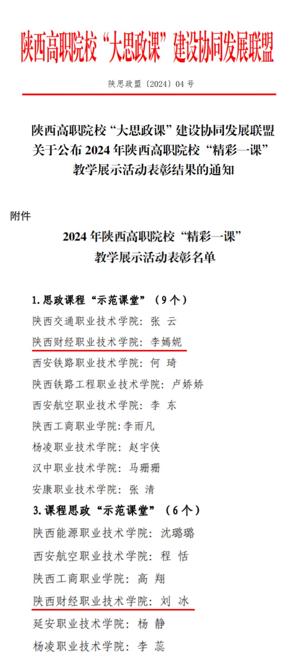 近日,陕西高职院校“大思政课”建设协同发展联盟公布了 2024 年陕西高职院校“精彩一课” 教学展示活动表彰结果,我校思政课教师李嫣妮、经济法教师刘冰凭借出色的授课技艺与教学理念,双双摘得“示范课堂”荣誉称号。