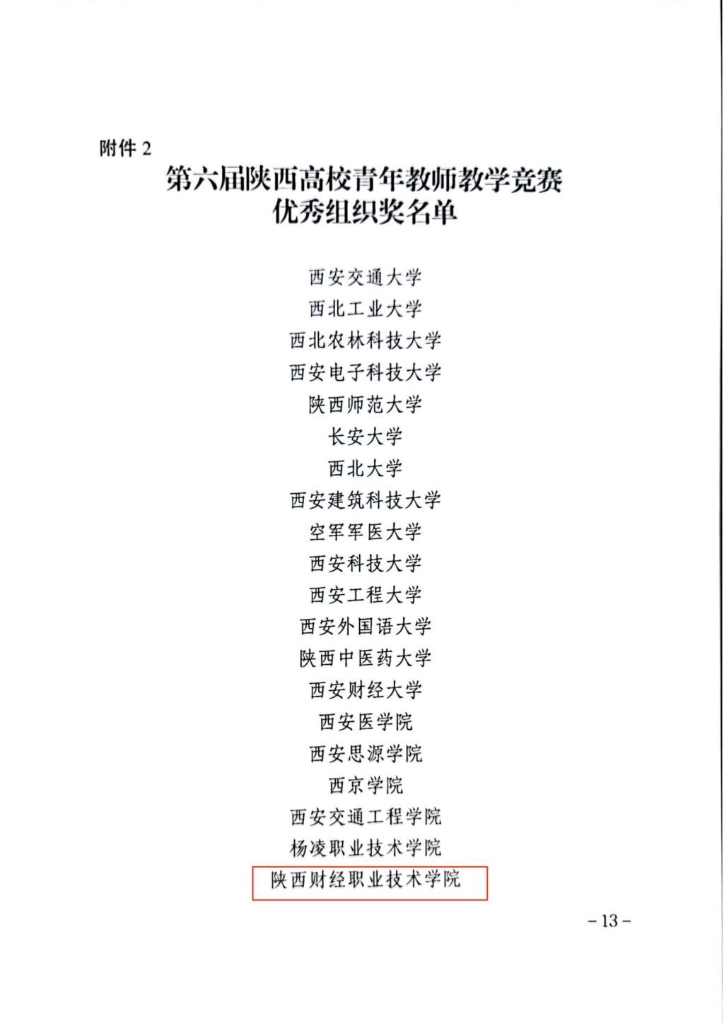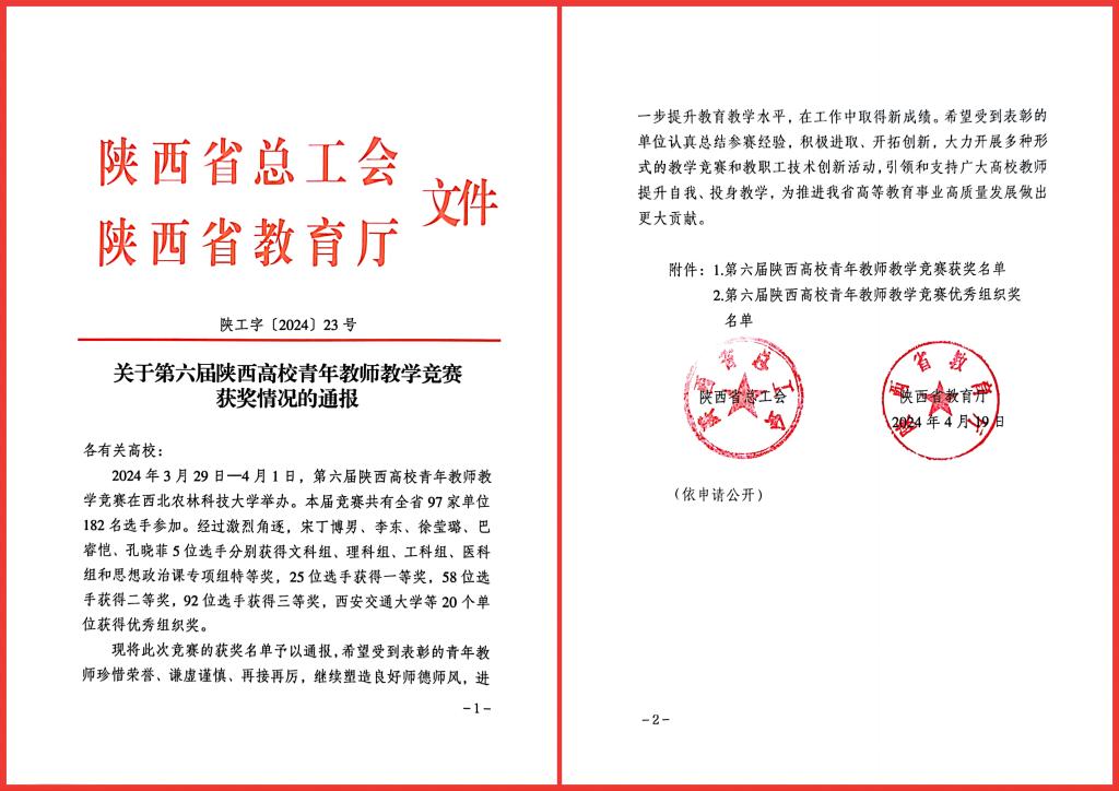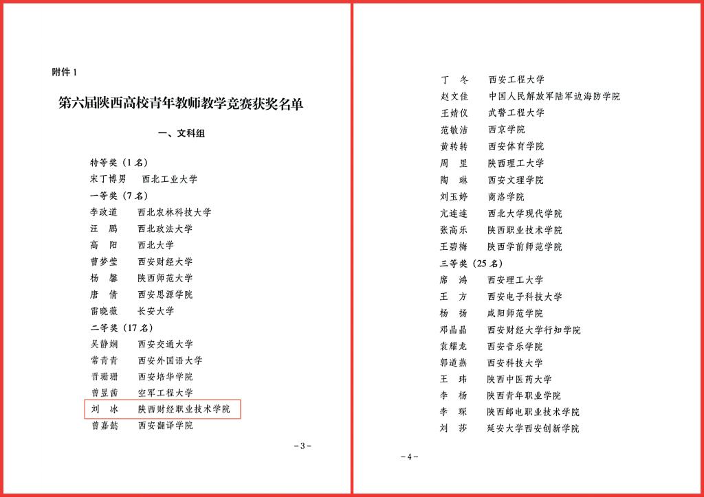 近日,由陕西省总工会、陕西省教育厅主办的第六届陕西高校青年教师教学竞赛在西北农林科技大学成功举办。经过3天的激烈角逐,我校刘冰老师最终凭借扎实的教学基本功、优秀的专业素养创造佳绩,荣获文科组二等奖,在高职组中名列第一。同时,学校荣获优秀组织奖,成为全省仅有的两所获此殊荣的高职院校之一。