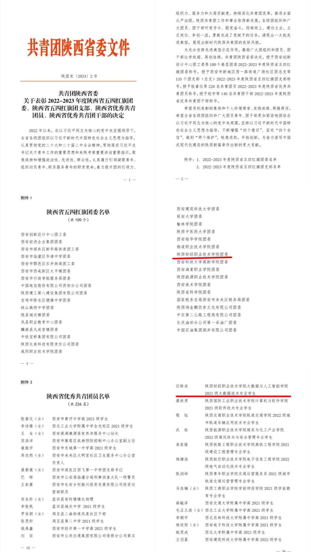 近日,共青团陕西省委下发了《关于表彰2022-2023 年度“陕西省五四红旗团委”、“陕西省五四红旗团支部”、“陕西省优秀共青团员”、“陕西省优秀共青团干部”的决定》的文件,我校团委摘得共青团陕西省委授予基层团组织的最高荣誉——“陕西省五四红旗团委”荣誉称号,同时,2021级大数据技术12班任盼欣同学荣获“陕西省优秀共青团员”称号。