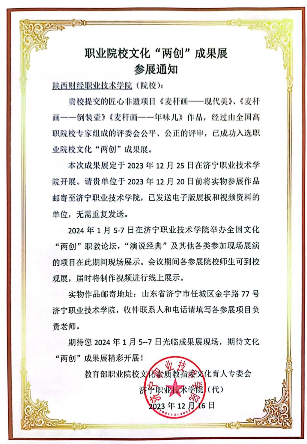 为了展示职业院校在文化“两创”工作方面形成的工作模式、特色经验及实践效果,2023年12月教育部职业院校文化素质教育指导委员会主办了面向全国职业院校的文化“两创”成果展示活动,本次活动内容包括“三教”改革、匠心非遗等九个方面,经过层层筛选与严格评审,我校选送的“匠心非遗麦秆画手工系列作品”“三教改革传统文化进课堂”2个项目成功入选职业院校文化“两创”成果展。