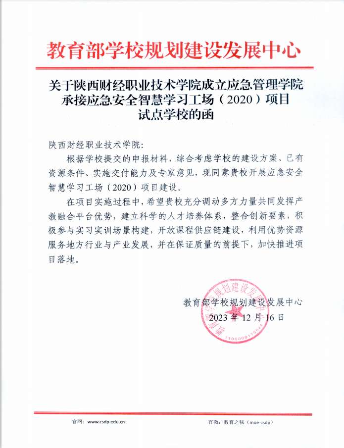 此次获批成立应急管理学院承接应急安全智慧学习工场项目试点学校,是我校推进“开门办学、开放办学、国际化办学”的又一重大突破。陕西财经职业技术学院应急管理学院将立足西咸、面向陕西、辐射周边省市地区,以应急管理方面人才培养、应用研究和社会服务为宗旨,整合校内外资源,建设区位优势突出、学科特色鲜明、服务于政府各级应急管理部门、国家各级救援队、能源化工企业安全应急技术与管理的高水平学院,为学生到消防、建筑安全、金融安全、信息安全等企业、政府部门(公安、应急管理、防灾减灾、森林安全等)就业实习搭建平台,为学生到更高层次的公安院校、应急管理学院、防灾科技学院深造助力,成为安全应急文化传承的基地,为防灾减灾事业和经济社会发展作出应有贡献。