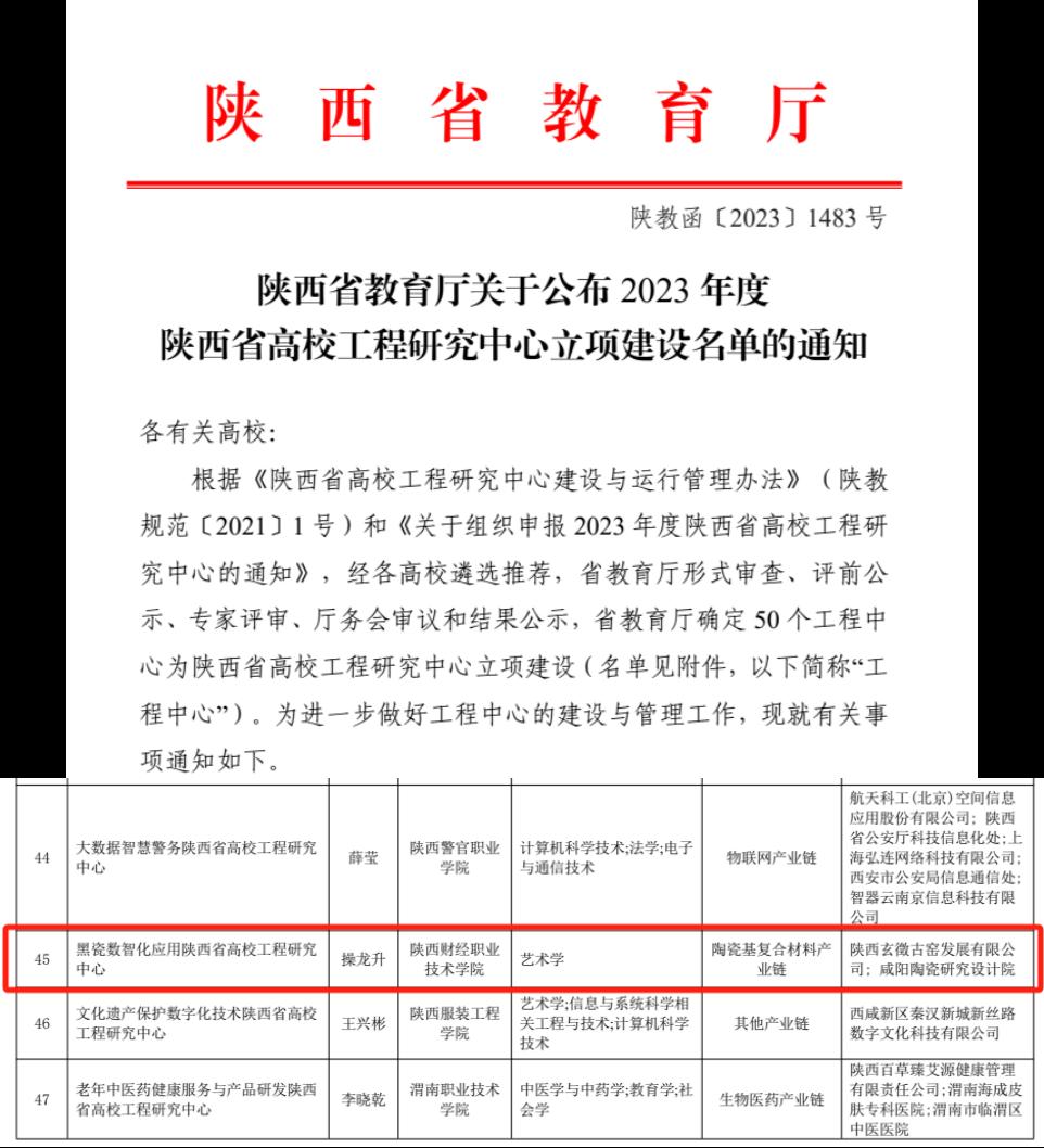 近日,根据《陕西省教育厅关于公布2023年度陕西省高校工程研究中心立项建设名单的通知》文件,我校申报的“黑瓷数智化应用陕西省高校工程研究中心”成功获批2023年度陕西省高校工程研究中心建设项目。据悉,本次全省共75个项目参与评选,最终50个项目入选,我校作为其中之一,这是我校首次入选工程中心研究项目,也是我校积极推动“双高”建设的标志性成果。