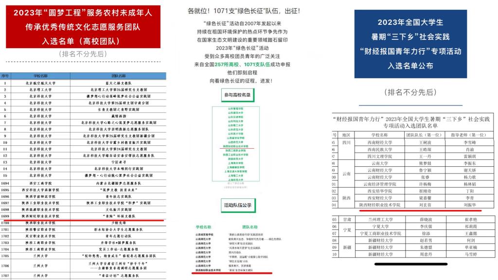 2023年暑期,团中央各相关组织单位发布了多项全国暑期社会实践专项实践活动项目,校团委积极动员、组织团队申报,在近期公布的各专项活动立项名单中,我校2支实践团队入选3项2023年全国暑期社会实践专项活动。其中,祝红艳、马晶照老师带领的“青烛”生态环保支教队入选2023年“圆梦工程”服务农村未成年人传承优秀传统文化志愿服务团队和2023年绿色长征科考实践活动团队;刘振华、王华老师带领的“微帮”电商网销服务队入选2023年全国大学生暑期“三下乡”社会实践“财经报国青年力行”专项活动团队。