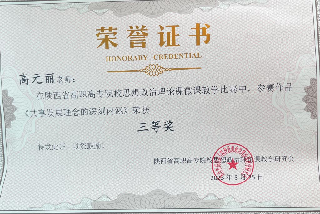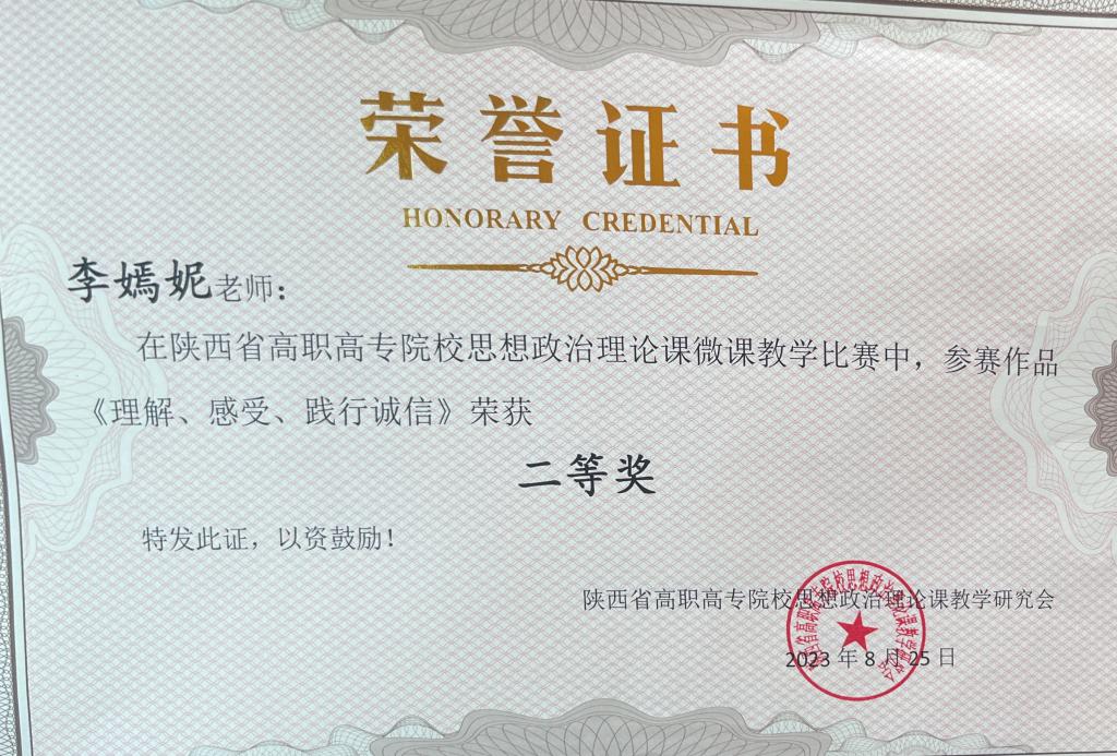 8月30日,陕西省高职高专院校思想政治理论课微课教学比赛总结表彰会在陕西铁路职业技术学院举办。共有来自全省高职高专院校的146名选手参与省级决赛。经过陕西省高职高专院校思想政治理论课教学研究会统一组织、专家评选打分,最终39名教师获得佳绩。在学校党委领导下,马克思主义学院第一时间组织思政课教师积极参加比赛,4名教师通过校内初赛晋级省级决赛。最终,我校思政课教师李嫣妮荣获微课比赛二等奖、高元丽荣获三等奖。