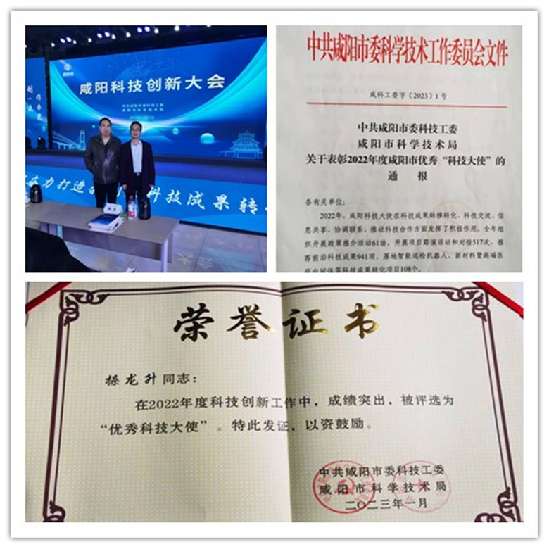 大会隆重而热烈,会上对2022年先进工业、农业科技特派员,优秀科技大使等进行了表彰,发布了2022年度咸阳市科技型中小企业排行榜,对2023年咸阳市科技创新工作进行了规划部署。操龙升被评选为2022年度“表彰奖励优秀科技大使”,姬勃为2022年度“鼓励奖励科技大使”,受到表彰。此次受聘158名科技大使中有78人获得表彰,我校荣获2席,这是对我校积极融入秦创原建设努力付出的肯定。我们将以此为契机,2023年扎实做好科技创新工作,进一步发挥产学研合作的优势作用,围绕区域高质量发展的科技需求,加强科研和科技成果转化等工作,竭力为咸阳科技创新工作贡献力量。