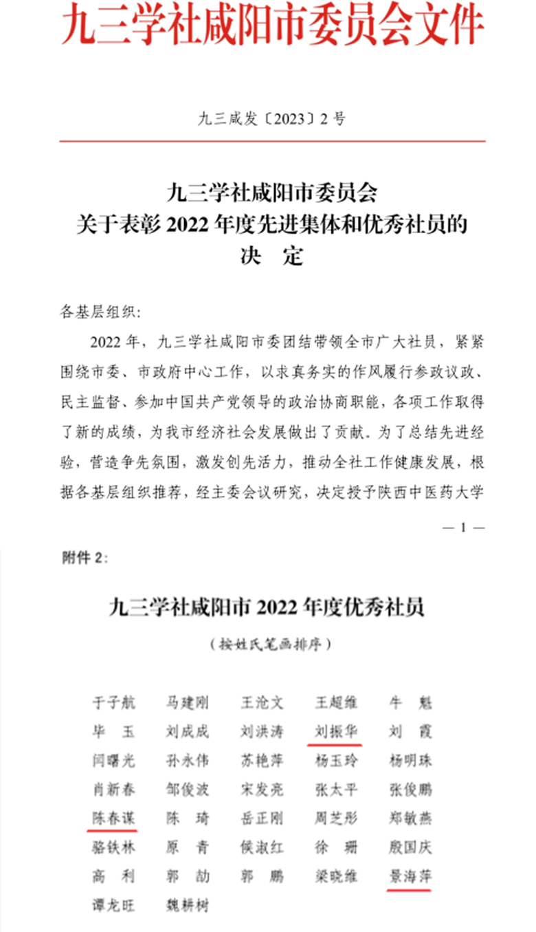 2023年1月6日,九三学社咸阳市委在咸阳市政协会议室召开2022年工作总结暨表彰会。会上,表彰通报了2022年度先进集体和优秀社员,我校景海萍、陈春谋、刘振华三位教师榜上有名,被授予“优秀社员”荣誉称号。