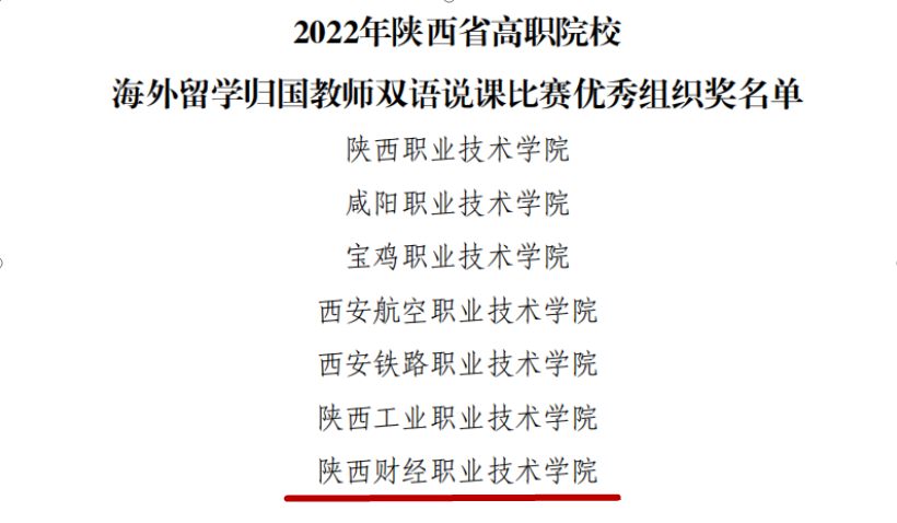 4月8日,由陕西省“一带一路”职教联盟和陕西省职教学会共同主办、陕西职业技术学院承办的首届陕西省高职院校海外留学归国教师说课比赛顺利举行。我校选派贺加贝、高妍两位教师代表参加本次比赛。经过激烈的角逐,我校商学院高妍(德语)获得三等奖,会计学院贺加贝(英语)获得优秀奖。同时,我校获得2022年陕西省高职院校海外留学归国教师双语说课比赛优秀组织奖。