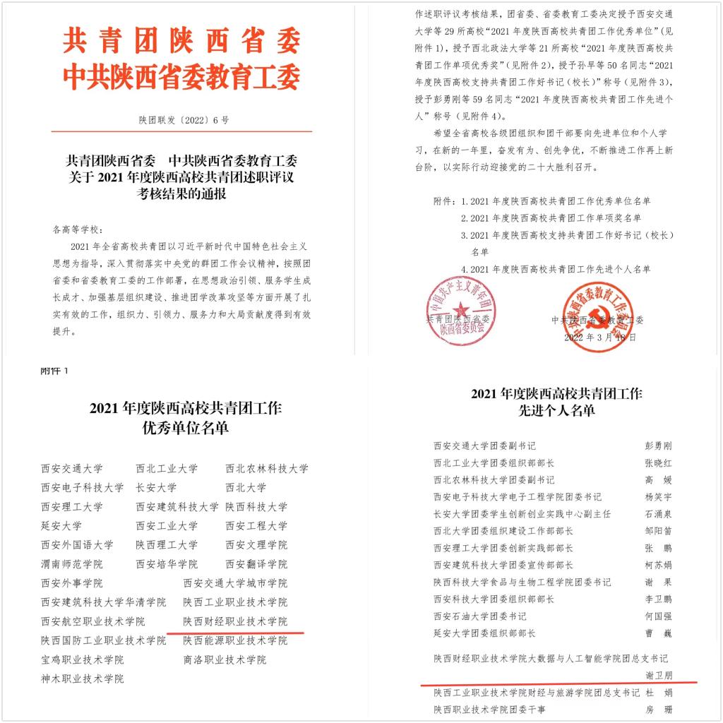 近日,共青团陕西省委、中共陕西省委教育工委联合下发《关于2021年度陕西高校共青团述职评议考核结果的通报》,我校再次荣获“2021年陕西高校共青团工作优秀单位”,大数据与人工智能学院团总支书记谢卫朋荣获“2021年陕西高校共青团工作先进个人”称号。