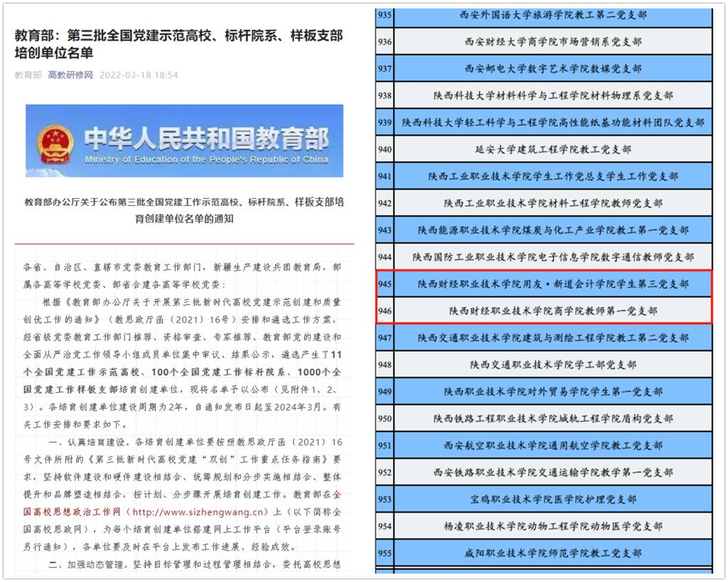 近日,教育部公布了第三批新时代高校党建示范创建和质量创优工作遴选结果,我校用友·新道会计学院学生第三党支部、商学院教师第一党支部获批“全国党建工作样板支部”培育创建单位。