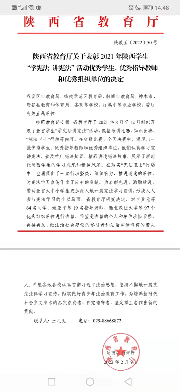 近日,省教育厅公布了2021年陕西省“学宪法讲宪法”主题系列活动评选结果,我校荣获本次活动“优秀组织单位”。