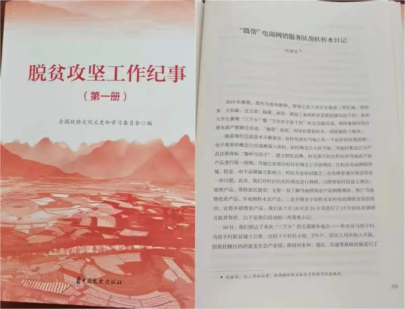 2021年8月,由全国政协文史委编辑的《脱贫攻坚工作纪事》史料图书出版发行。我校统战对象、九三学社社员、副教授刘振华撰写的《“微帮”电商网销服务队帮扶柞水日记》被收录其中。