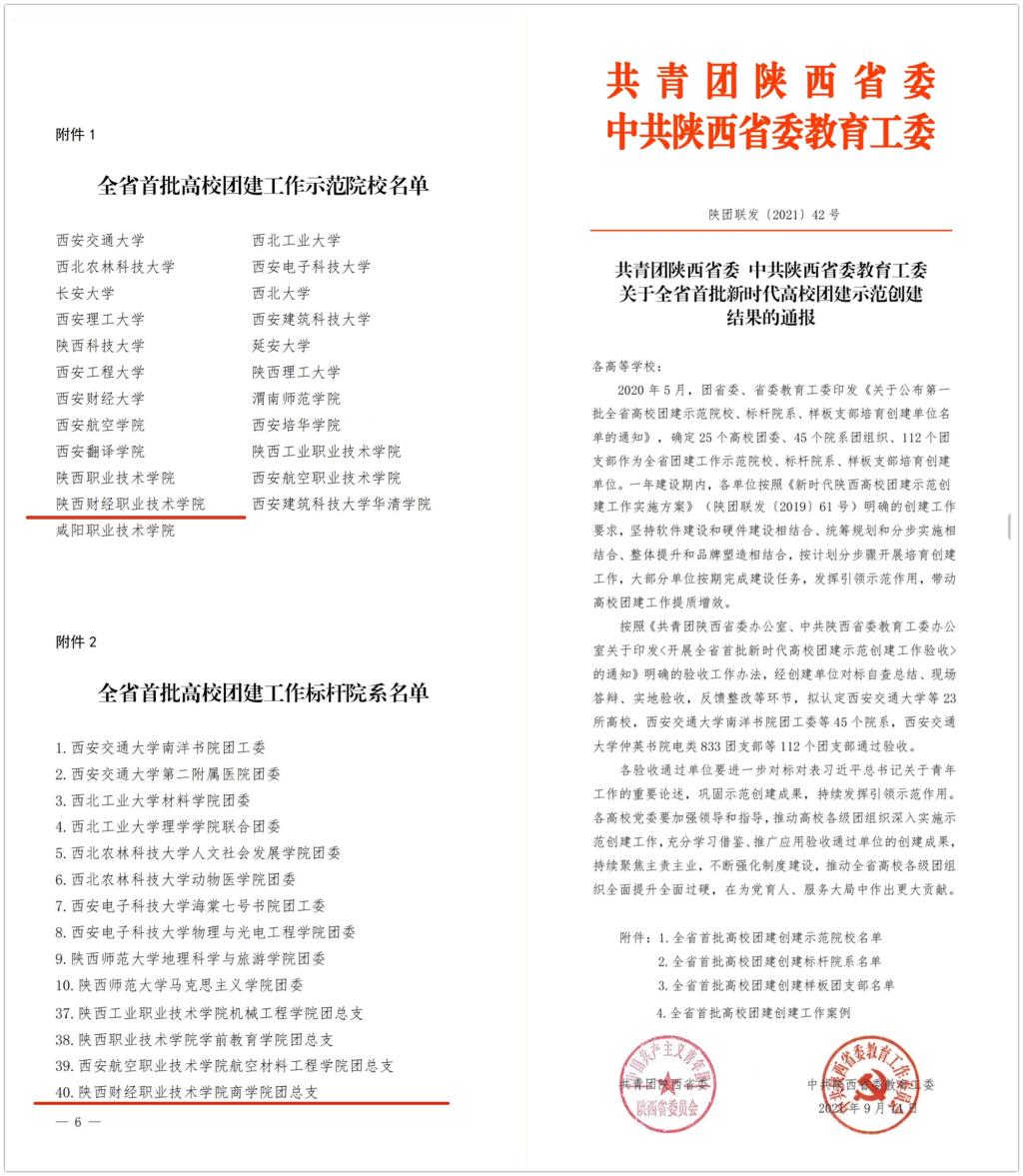近日,共青团陕西省委、中共陕西省委教育工委联合下发《关于全省首批新时代高校团建示范创建结果的通报》陕团联发〔2021〕42号文件,我校荣获“全省首批高校团建工作示范院校”称号,商学院团总支荣获“全省首批高校团建工作标杆院系”称号,《创新打造团建示范创建基地》的工作案例入选全省首批高校团建创建工作案例,是获批5所高职示范院校唯一入选的工作案例。