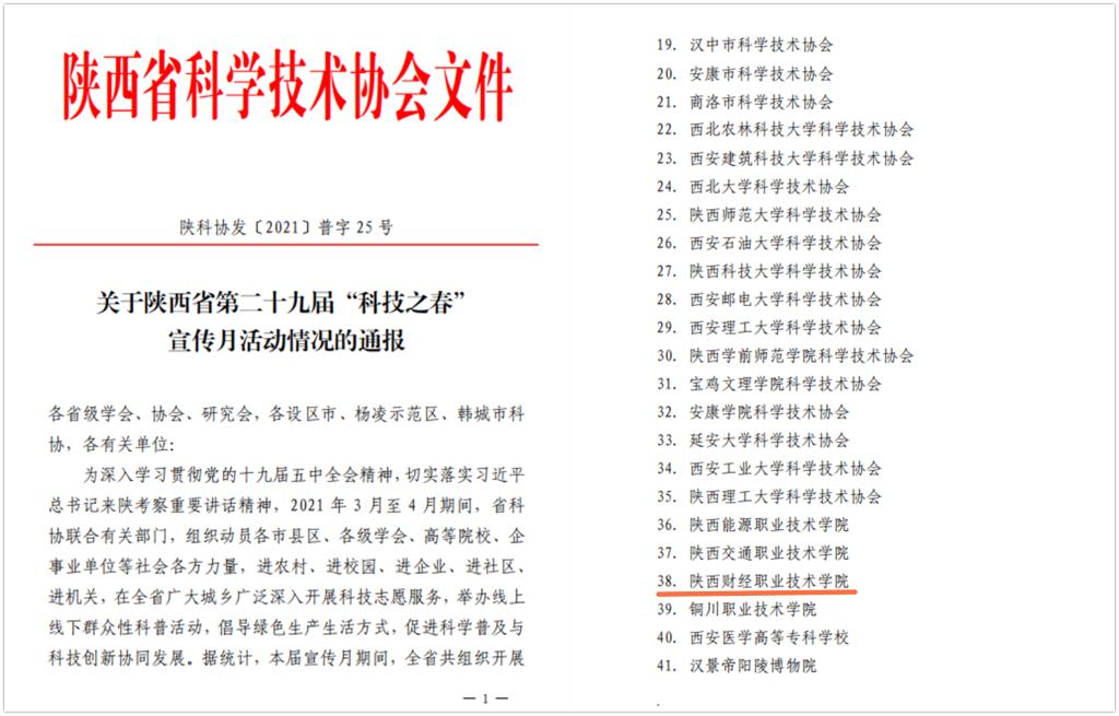 据陕西省科学技术协会《关于陕西省第二十九届“科技之春”宣传月活动情况的通报》(陕科协发〔2021〕普字25号)获悉,我校荣获陕西省第二十九届“科技之春”宣传月活动先进单位。