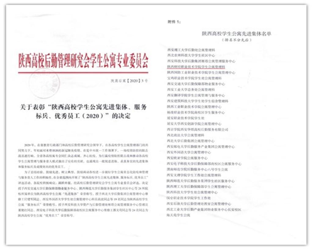 2020年6月19日,陕西高校后勤管理研究会学生公寓专业委员会暨学生公寓管理服务工作表彰会在西北工业大学长安校区南山苑举行,会议表彰了2019年度全省公寓先进集体和个人,我院学生公寓管理科荣获“陕西高校先进集体”荣誉称号。