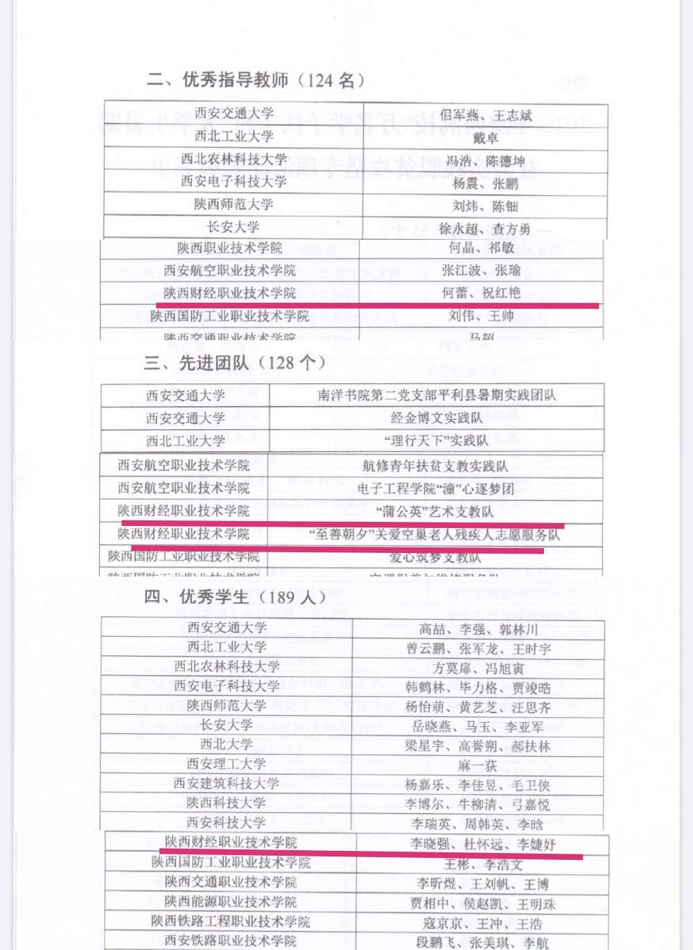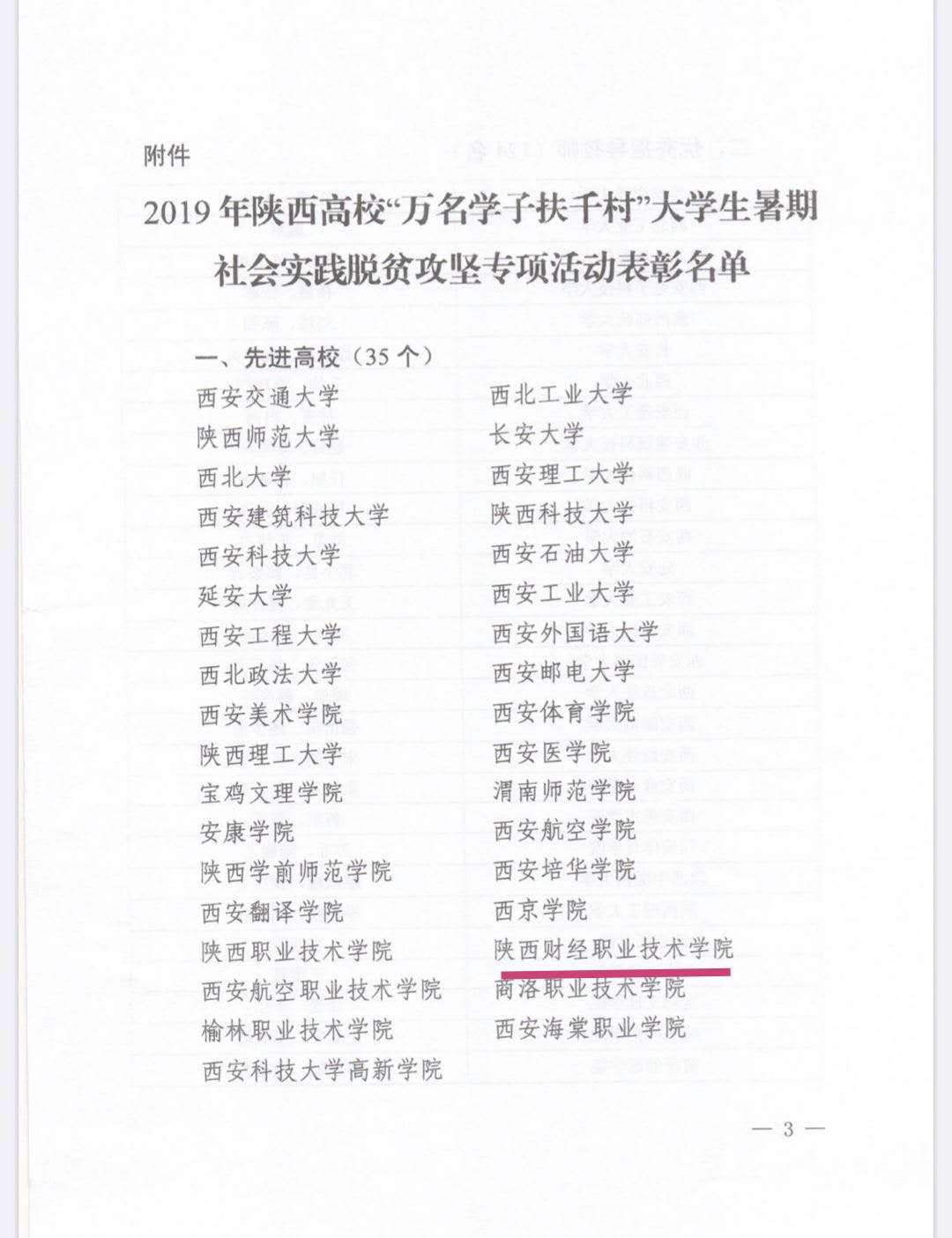 2020年3月12日,中共陕西省委教育工委、共青团陕西省委联合下发陕教工【2020】45号《关于表彰2019年陕西高校“万名学子扶千村”大学生暑期社会实践脱贫攻坚专项活动先进集体和个人的通报》,我院荣获全省“先进高校”称号,“蒲公英”艺术支教队、“至善朝夕”关爱空巢老人残疾人志愿服务队荣获全省“先进团队”称号,何蕾、祝红艳荣获全省“优秀指导教师”称号,李晓强、杜怀远、李婕妤荣获全省”优秀学生“称号。