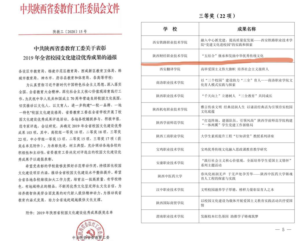 近年来,院领导十分重视这项全省高校校园文化展现活动。为了全面展现我院校园文化建设成就亮点,团委在主管院领导的指导下,对我院校园文化建设的各个方面及开展的各项活动进行了梳理和提炼,以我院近年来深入实施的“厚德育人工程”为背景,通过“弘扬传统文化•追忆古今风尚——我们的节日”系列活动、“品味农耕文化 •承袭华夏之美——二十四节气”系列活动、高雅艺术进校园、“有一天我们也会变老”关爱空巢老人公益项目、“日行一善”主题教育、三下乡传统文化支教队、传统文化类社团等大量的素材为依托,呈现了学院独特的大学生素质教育模式,即将中华优秀传统文化与校园文化、志愿服务、社会实践、第二课堂、创新创业相结合的“五结合”教育模式,把中华优秀传统文化融入到“第二课堂”全过程。深化社会主义核心价值观,培育富有时代精神和财经特色的校园文化,从而构筑了陕财职院永恒的精神家园等内容,形成图文并茂的校园文化建设成果——《“五结合”继承和发扬中华优秀传统文化》。