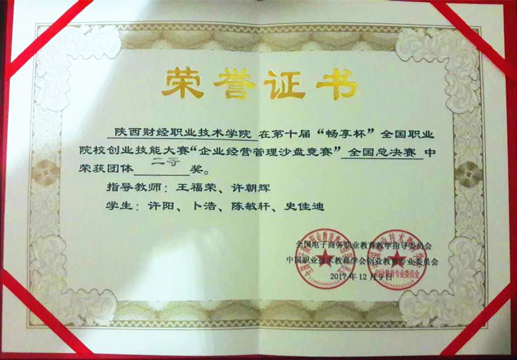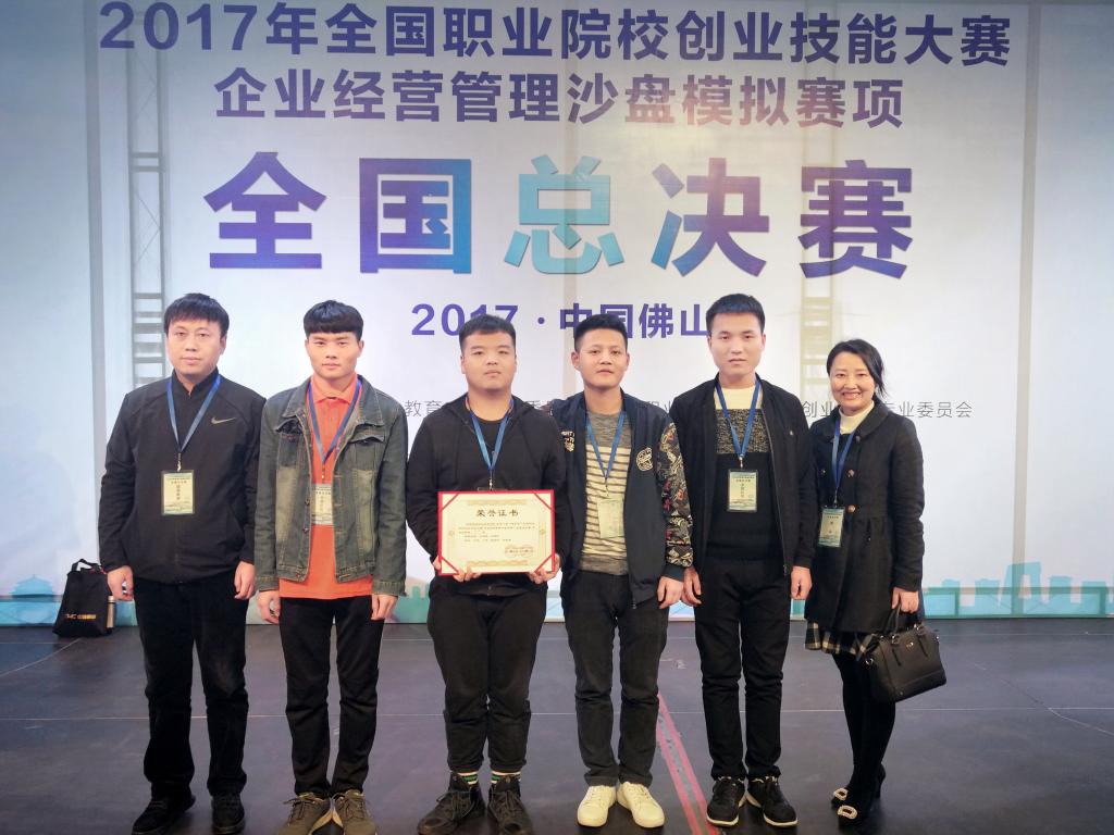 2017年12月8号到10号,“全国职业院校创业技能大赛企业经营管理沙盘模拟赛项”全国总决赛在佛山职业技术学院开赛,来自全国各地有119个学校138支队伍1000多人参赛,本届赛事由教育部全国电子商务职业教育教学指导委员会、中国职业技术教育学会创业教育专业委员会主办,佛山职业技术学院承办。我院经济与金融管理系教师许朝辉、王福荣指导的学生卜浩、许阳、史佳迪、陈敏轩组成的代表队,在竞争激烈的赛场上,取得国赛二等奖。