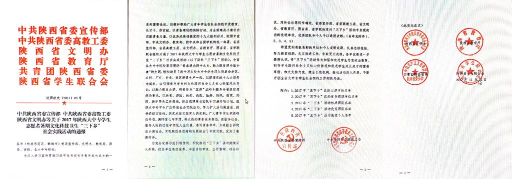 2017年11月22日,中共陕西省委宣传部、中共陕西省委高教工委、陕西省文明办、陕西省教育厅、共青团陕西省委、陕西省学生联合会等六部委联合下发《关于2017年陕西大中专学生志愿暑期文化科技卫生“三下乡”社会实践活动的通报》,我院荣获全省“优秀组织单位”称号,“青衿”传统文化支教服务队荣获全省“标兵团队”称号,普法宣传志愿服务队、“蒲公英”艺术支教队、“微邦”电商网校服务队荣获全省“优秀团队”称号,张馨予、乔乐荣获全省“先进个人”称号。