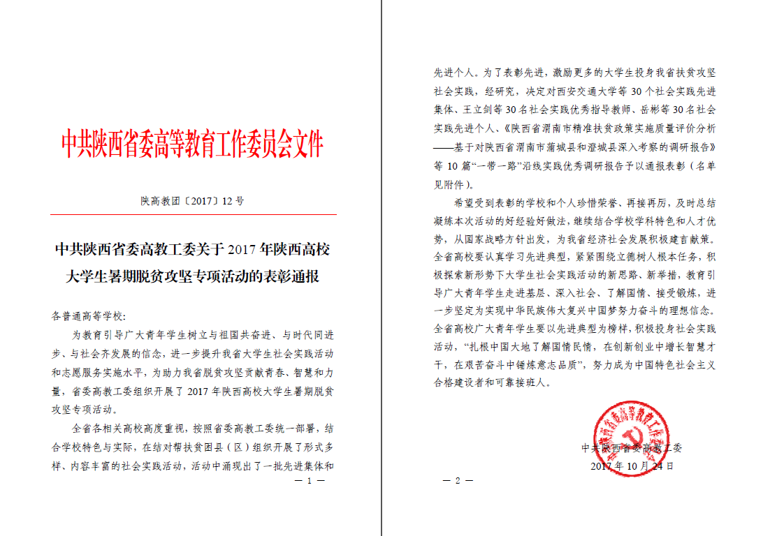 近日,陕西省委高教工委下发了《中共陕西省委高教工委关于2017年陕西高校大学生暑期脱贫攻坚专项活动的通报表彰》,我院被评为先进集体,基础部副教授乔秋珍荣获优秀指导教师,社团联合会主席张海松荣获先进个人。