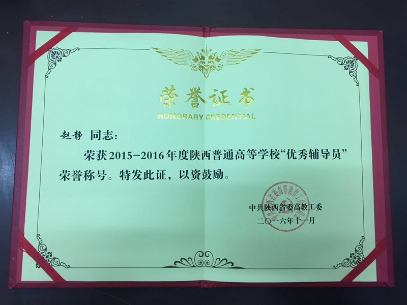 近日,根据省委高教工委《关于开展2015-2016年度陕西普通高等学校优秀辅导员和十佳辅导员评选表彰活动的通知》精神,我院会计二系赵静同志被授予陕西高等学校“优秀辅导员”荣誉称号。