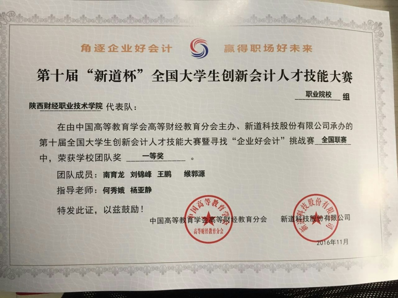 近日,从“新道杯”全国大学创新会计人才技能大赛暨寻找“企业好会计”挑战赛全国联赛组委会传来喜讯,在全国763支参赛队伍和3056名参赛学生中,代表我院参赛的两支队伍分列全国职业院校组团队第一名和第二名,荣获团队一等奖,2名学生获得个人一等奖,4名学生获得个人二等奖,2名同学获得个人三等奖,2名老师被评为“优秀指导老师”。