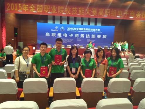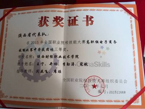 2015年7月2日,全国职业院校技能大赛高职组电子商务技能赛项总决赛在天津商务职业学院举行。来自全国的76支代表队参加了此次比赛。经过一整天激烈的角逐,最终由我院13级电子商务班井楠、王宁、寇航、李勋涛等四位同学组成的代表队获得总决赛团体三等奖。闫亚飞、席瑶作为指导老师获得了表彰。