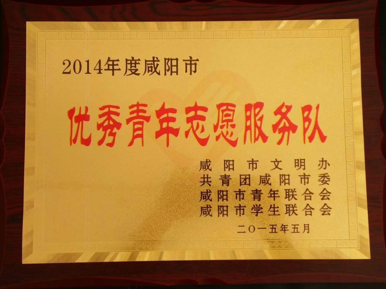 我院青年志愿者服务队被授予咸阳市“优秀青年志愿服务队”光荣称号,团委钱涌宁被评为2014年度咸阳市优秀青年志愿者。