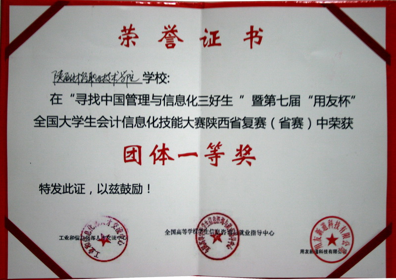 11月3日,2013年“寻找中国管理与信息化三好生”暨第七届“用友杯”全国大学生会计信息化技能大赛陕西赛区复赛在延安举行,来自全省十所院校的19支代表队在延安职业技术学院展开激烈的角逐。我院派出了由10名学生组成的两支代表队获得了团体第一名的好成绩。其中袁娅丽、张晓艳、郝萌萌3位同学包揽了个人一等奖,获得全国总决赛入场券;其余7名同学在个人赛中有3名获得了二等奖,4名获得了三等奖。信息工程系李迎老师、阎栋老师获得了优秀指导老师荣誉称号。