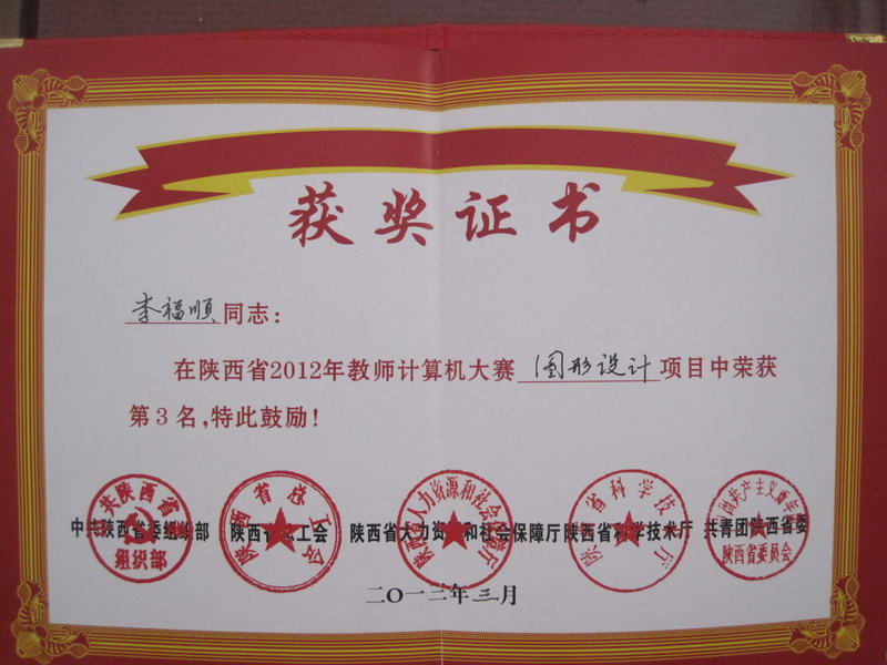 由陕西省人力资源和社会保障厅、省教育厅、省总工会主办,省职业技能鉴定指导中心承办的2012年陕西省计算机“教师高手”大赛成绩最近揭晓。此次大赛主赛场设在西安外事学院,宝鸡、咸阳、榆林、安康、商洛设立分赛场,来自全省各高校、中等职业学校及技工院校的500余名计算机教师参加了此次技能大赛,我院信息工程系李福顺老师以扎实的基础理论和过硬的实践操作技能在图形设计项目中获得第3名,为学院争得了荣誉。