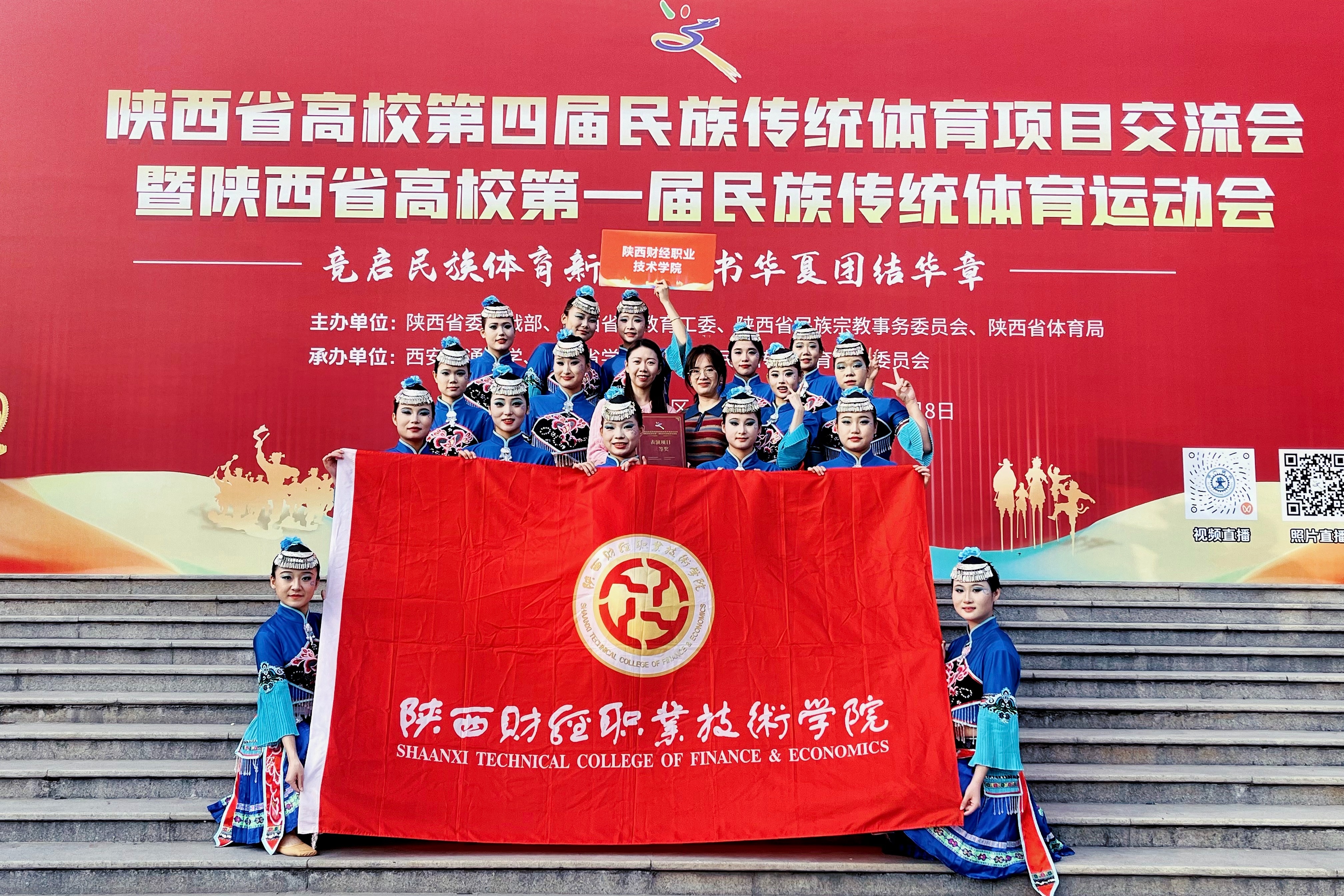 11月8日,陕西省高校第四届民族传统体育项目交流会暨陕西省高校第一届民族传统体育运动会在西安交通大学思源活动中心举办。全省42所高校、50支代表队的800余名队员参与展演,为现场观众展示了腰鼓、武术、射艺、舞龙、摔跤、民族健身操等多项民族传统体育项目。我校选送的《石榴籽同心・健身绽芳华》民族健身操,与本科院校同场竞技,经视频评审和现场展示两轮竞演,以高职院校第一名的成绩,荣获表演项目(民传类)三等奖,为学校争得了荣誉。