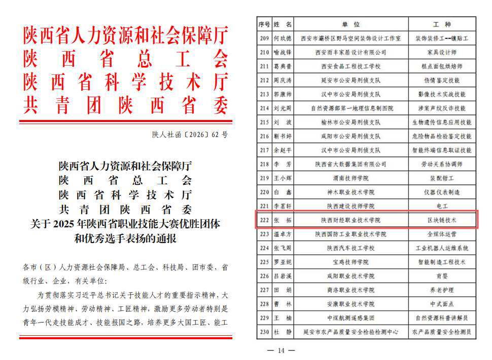 近日,陕西省人力资源和社会保障厅、陕西省总工会、陕西省科学技术厅、共青团陕西省委联合印发《关于2025年陕西省职业技能大赛优胜团体和优秀选手表扬的通报》(陕人社函〔2026〕62号),对在2025年陕西省职业技能大赛中表现突出的选手予以表彰。我校大数据与人工智能学院专任教师张拓凭借区块链技术赛项第一名的优异成绩名列其中,并被授予“陕西省技术能手”荣誉称号。
