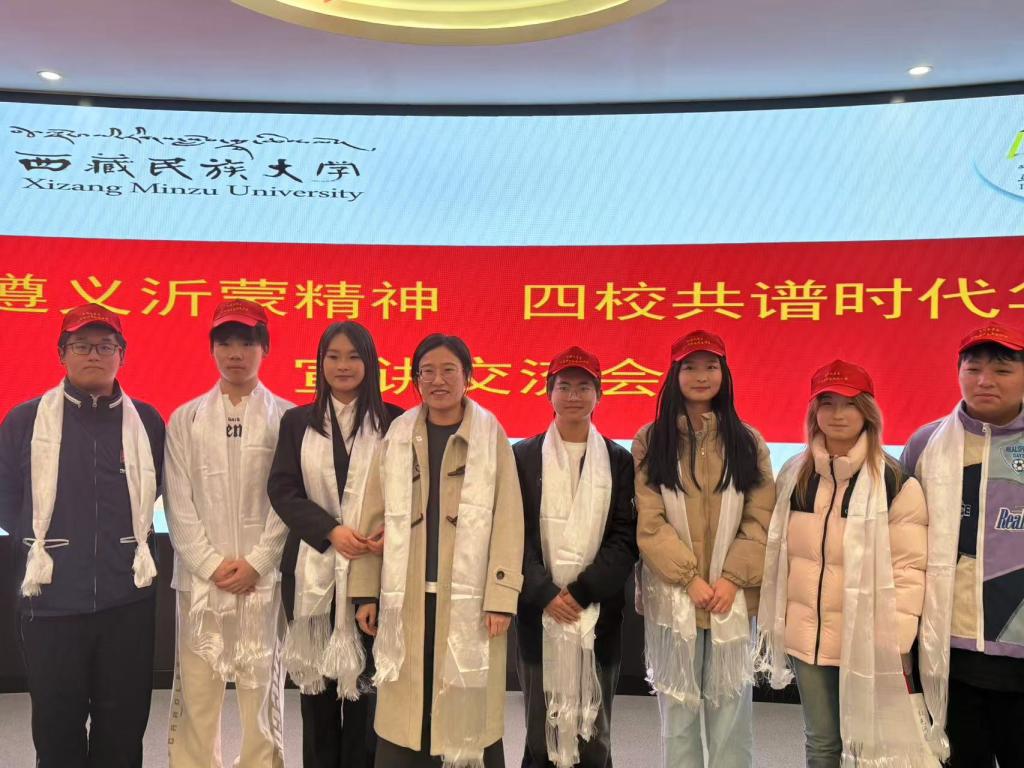 为深入学习贯彻习近平新时代中国特色社会主义思想和党的二十届三中全会精神,落实“强国复兴有我”群众性主题宣传教育活动相关要求及教育工作,以校际合作大力推动红色革命精神传播,11月20日,我校红色问道之旅宣讲团受邀参加“弘扬遵义沂蒙精神,四校共谱时代华章”宣讲交流会。该活动由西藏民族大学主办,并邀请陕西财经职业技术学院、陕西中医药大学、咸阳师范学院等三所院校参与,全场共计百余人参加宣讲活动。我校由红色问道之旅宣讲团指导教师郭松月带队,宣讲团8名成员参加。